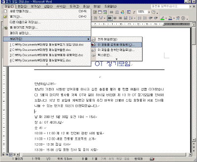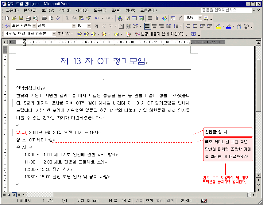 ÇϳªÀÇ ¹®¼­¸¦ °¡Áö°í ¿©·¯ »ç¶÷ÀÌ ÇÔ²² ÀÛ¾÷À» ÇÏ´Â °ÍÀº ȸ»ç¿¡¼­ ÈçÈ÷ ¹ß»ýÇÏ´Â ÀÏÀÌ´Ù. º¸Åë ÇÑ »ç¶÷ÀÌ ÀÛ¼ºÇÑ ´ÙÀ½ ÀüÀÚ ¸ÞÀÏ·Î ¹®¼­¸¦ ÷ºÎÇÏ¿© º¸³»´Â ¹æ¹ýÀ» »ç¿ëÇÏÁö¸¸ ¸¹Àº »ç¶÷ÀÌ ¼öÁ¤À» ÇßÀ» °æ¿ì¿¡´Â ¿øº»ÀÇ ³»¿ëÀÌ ¹«¾ùÀÎÁö, ¾î¶² »ç¶÷ÀÌ ¾î¶² ³»¿ëÀ» ¼öÁ¤Çß´ÂÁö È®ÀÎÇÏ´Â ¹æ¹ýÀÌ ½±Áö ¾Ê´Ù. ÀÌ·± Á¡À» º¸°­ÇÏ¿© ¿ÀÇǽº XP¿¡¼­´Â º¸´Ù ¹®¼­¸¦ ½±°Ô °ËÅäÇÏ°í ºñ±³, ÅëÇÕÇÒ ¼ö ÀÖµµ·Ï °ËÅä¿ë ¸ÞÀÏ º¸³»±â ±â´ÉÀÌ Ãß°¡µÇ¾ú´Ù. ÀÌ ±â´ÉÀ» ÀÌ¿ëÇÏ¸é °ËÅäÀÚ º°·Î ¼öÁ¤ÇÑ ³»¿ëÀ» È®ÀÎÇÒ ¼ö ÀÖ°í, ¼öÁ¤ »çÇ×À» ºü¸£°Ô ÅëÇÕÇÒ ¼ö ÀÖ´Ù. ¿öµå, ¿¢¼¿, ÆÄ¿öÆ÷ÀÎÆ®, ¾×¼¼½º¿¡¼­ µ¿ÀÏÇÏ°Ô »ç¿ëÇÏ´Â ¹æ¹ýÀ̹ǷΠ¿©±â¼­´Â Á¤±â ¸ðÀÓ¿¡ °üÇÑ ¿öµå ¹®¼­¸¦ °¡Áö°í ÀÛ¾÷ÇÏ´Â ¹æ¹ý¿¡ ´ëÇØ ¾Ë¾Æº¸µµ·Ï ÇÏÀÚ.