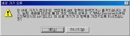 [¹Ù·Î °¡±â ¾ÆÀÌÄÜ] ¨± ±â·Ï : ÀÌÀü¿¡ ¼±ÅÃÇÑ Æú´õ ¹× ÆÄÀÏÀ» ¹Ù·Î°¡±â ¾ÆÀÌÄÜÀ¸·Î ±â·ÏÇØ ÁØ´Ù. ½Å¼ÓÇÏ°Ô ÀÌÀü¿¡ »ç¿ëÇß´ø ÆÄÀÏÀ̳ª Æú´õ¸¦ ãÀ» ¼ö ÀÖ´Ù. ¸¸¾à ÆÄÀÏÀÌ »èÁ¦µÇ¾î ÆÄÀÏÀ» ¹Ù·Î°¡±â ¾ÆÀÌÄÜÀ» ãÀ» ¼ö ¾øÀ¸¸é ´ÙÀ½°ú °°Àº ¸Þ½ÃÁö°¡ ³ªÅ¸³´Ù. ¨² My Documents : ³» ¹®¼ Æú´õ¿¡ ÆÄÀÏÀ» ÀúÀåÇÑ´Ù. ¨³ ¹ÙÅÁȸé : ÇöÀç ÆÄÀÏÀ» ¹ÙÅÁȸ鿡 ÀúÀåÇÑ´Ù. ¨´ Áñ°Üã±â : ÇöÀç ÆÄÀÏÀÌ ÀÎÅÍ³Ý ÀͽºÇ÷η¯ Áñ°Üã±â¿¡ µî·ÏµÇ¾î ¾ðÁ¦µçÁö À¥ ºê¶ó¿ìÀú¿¡¼ ¿¾î º¼ ¼ö ÀÖ´Ù. Áñ°ÜªO±âÀÇ À§Ä¡´Â [C:\Windows\Favorites] ÀÌ´Ù. ¨µ Web Folders : À¥ Æú´õ ±â´ÉÀ» »ç¿ëÇÏ¿© À¥ ¼¹ö¿¡ ÆÄÀÏÀ» ÀúÀåÇÒ ¼ö ÀÖ´Ù. À©µµ¿ì Ž»ö±â³ª Microsoft PowerPointÀÇ ÆÄÀÏ ¸Þ´ºÀÇ ¿±â ¶Ç´Â ´Ù¸¥ À̸§À¸·Î ÀúÀå ´ëÈ »óÀÚ¿¡¼ À¥ Æú´õ¿¡ ¾×¼¼½ºÇÒ ¼ö ÀÖ´Ù. Windows Ž»ö±â Web FoldersÀÇ ·çÆ® µð·ºÅ丮¿¡´Â À¥ Æú´õ Ãß°¡ ¸¶¹ý»ç°¡ ÀÖ´Ù. ÀÌ ¸¶¹ý»ç¸¦ »ç¿ëÇÏ¿© À¥ ¼¹ö¿¡ ´ëÇÑ ¹Ù·Î °¡±â°¡ ÀÖ´Â Æú´õ¸¦ ¸¸µé ¼ö ÀÖ´Ù. ÀÌ·¯ÇÑ ¹Ù·Î °¡±â¸¦ À¥ Æú´õ¶ó°í ÇÑ´Ù.